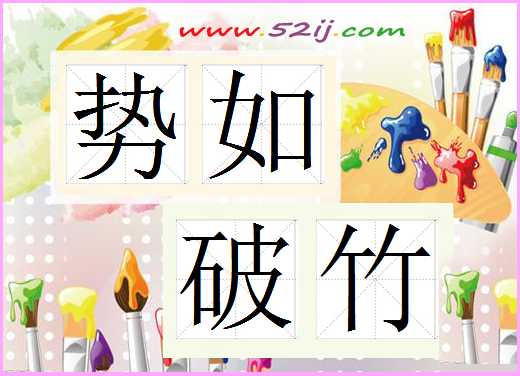 成语解释:势如破竹的意思——势:气势;威力;破竹:劈开竹子。气势就像劈竹子一样;劈开了头几节;下面各节就顺着刀势分开了。比喻打仗或工作毫无阻挡;节节胜利。