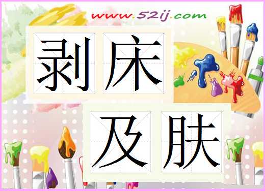 成语解释:剥床及肤的意思——剥:六十四卦之一,坤下艮上,意即剥落、烂;及:到。原指损害及于肌肤。后形容迫切的灾害或深切的痛苦。