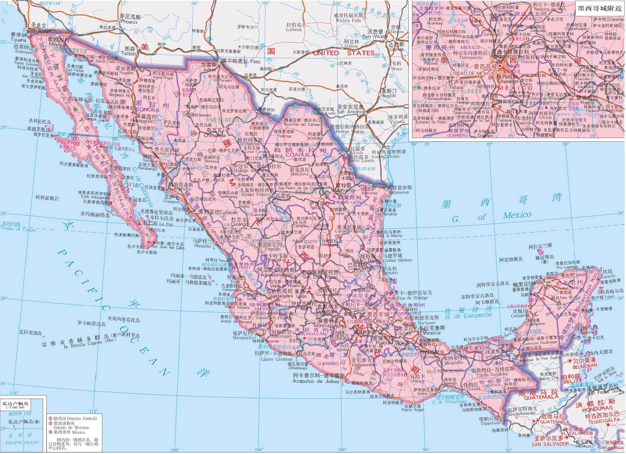 墨西哥合众国(英语:The United States of Mexico,西班牙语:Los Estados Unidos Mexicanos)位于北美洲,北部与美国接壤,东南与危地马拉与伯利兹相邻,西部是太平洋和加利福尼亚湾,东部是墨西哥湾与加勒比海,首都为墨西哥城。墨西哥是一个自由市场经济体,拥有现代化的工业与农业,私有经济比重也在大幅提升。1994年北美自由贸易区正式建立后,墨西哥与美国的贸易和投资往来增加很快,极大地促进了经济发展和国民收入提高。