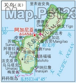 地图概述: 关岛(The Territory of Guahan/Guam)是位于西太平洋的岛屿,美国海外属地,是美国的非宪辖管制领土,本岛原住民是查莫罗人,约在3500年前在此定居。首府是阿加尼亚(Hagatn~a,旧名Agan~a)。美军基地占地约全岛的1/4。关岛现仍被联合国列为非自治领土。位于马里亚纳群岛最南端,是通向密克罗尼西亚的门户。被誉为“免税购物天堂”。