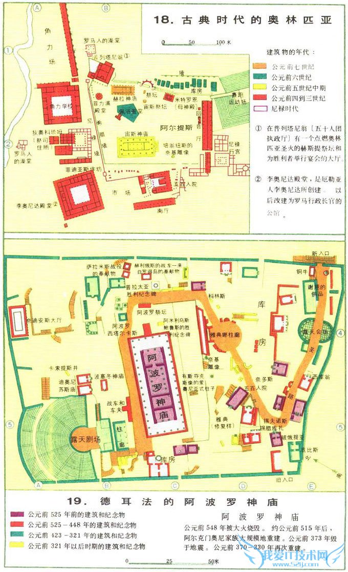 公元前2世纪之前的奥林匹亚地图。其中阿波罗神庙该庙被希腊人视为世界中心所在,在古代崇拜极盛,它是公元前6世纪暴君Lygdami所建立的,公元前494年,米勒图斯城因战争被波斯人烧毁,阿波罗神庙也随之被毁。西元334年,马其顿国王亚历山大大帝赶走波斯人,并开始重建神庙。