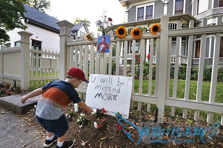Touching: AJ Polis leaves a flower alongside a placard and a photo of the late actor Robin Williams, as people pay their respects at the home where the 80's TV series "Mork & Mindy",was set, in Boulder, Colorado.¸ÐÈËÒ»¿Ì£º¿ÆÂÞÀ¶àÖݲ©¶ûµÂµØÇø¡¢80Äê´úµçÊӾ硶Ī¿ËºÍÃñµÏ¡·µÄÅÄÉãµØ£¬Ð¡Äк¢AJ PolisÔÚÒ»¸ö±êÓïÅÆÅԱ߷ÅÁËÒ»Êø»¨ºÍÒÑÊÅÂÞ±ö¡¤ÍþÁ®Ä·Ë¹µÄÕÕÆ¬£¬ÈËÃÇÓÃÕâÖÖ·½Ê½×·µ¿Õâλΰ´óµÄϲ¾çÑÝÔ±¡£