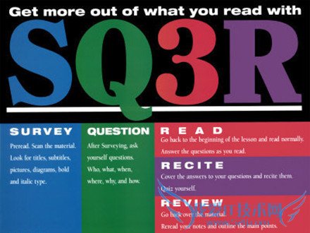 SQ3R is a reading strategy formed from its letters: Survey! Question! Read! Recite! Review!SQ3R是一种阅读方法,由英语Survey,Question,Read,Recite,Review五个词的第一个字母组合而成,分别代表“浏览、发问、阅读、复述、复习”五个学习阶段。