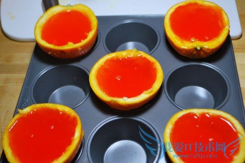 3. Open up the jello mix and place it into a large bowl. Then add 1 cup of boiling water and stir until the jello crystals have dissolved. Then pour in the vodka mixture and stir. Place the orange halves on a muffin tin to keep them upright. Then pour the jello into each orange half. Make sure to pour it all the way to the top.½«¹û¶³·Û·ÅÈëÒ»¸ö´óÍ룬¼ÓÈëÒ»±ÈÈË®½Á°è»ìºÏÖ±ÖÁÆäÈ«²¿ÈÚ»¯£¬Ëæºó½«»ìºÏºÃµÄ·üÌØ¼Óµ¹Èë½Á°è¡£½«ÇаëÁ˵ijÈ×Ó·ÅÈëËɱýºÐÖÐʹÆä¹Ì¶¨£¬È»ºó½«»ìºÏºÃµÄÒºÌåµ¹Èë°ë¸ö³È×Ó£¬È·±£½«³È×ÓÈ«²¿µ¹Âú¡£
