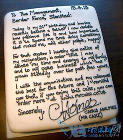 Chris Holmes, aka Mr Cake from Cambridgeshire, delivered the cake to "The Management" at the Border Force in Stansted on his birthday on 15 April.克里斯-霍姆斯,现在同样也是英国剑桥郡一位的蛋糕烘培师傅,在自己4月15日的生日当天将辞职蛋糕寄到了斯坦斯特德机场边防部的管理处。