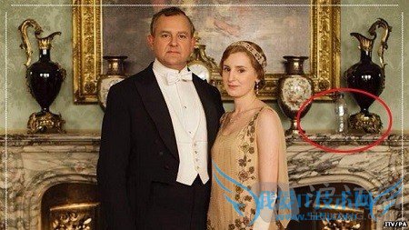 In the original photo, the modern bottle was perched on a mantelpiece behind Hugh Bonneville and Laura Carmichael, who were in costume as the Earl of Grantham and Lady Edith.ÔÚ´©°ïµÄÄÇÕžçÕÕÖУ¬¸ñÀ¼ÉªÄ·²®¾ôÓëÒÁµÏ˹С½ã£¨·Ö±ðÓÉÐÝ¡¤²©ÄÚÍþÀûºÍÀÍÀ¡¤¿¨¶ûÂõ¿Ë¶ûÊÎÑÝ£©ÉíºóµÄ±Ú¯¼ÜÉÏ·Å×ÅÒ»¸öÏÖ´ú¸ÐÊ®×ãµÄ¿óȪˮƿ¡£