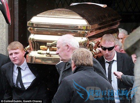 Irish gangster Andy Connors laid to rest in £25,000 GOLD coffin.爱尔兰黑帮老大安迪·康纳斯遇刺后睡在价值2万5千英镑的金棺材中下葬。