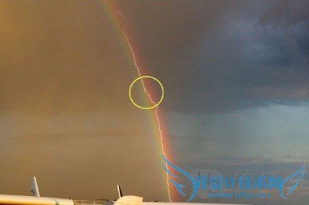 Incredible moment lightning hits plane mid-flight while passing through a rainbow. 震撼瞬间:飞机穿越彩虹,被闪电击中。