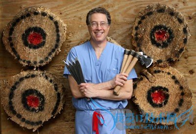 Ted Eisenberg holds the world record for the most breast operations - and finds time for a spot of knife-throwing in his spare time.泰德·艾森伯格是世界上进行隆胸手术最多的医生,他有一项业余爱好,那就是“扔飞刀”表演。
