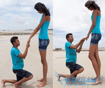 Despite a massive 1ft 4ins between them, Francinaldo had no problem increasing the distance by dropping to one knee after a romantic stroll along the beach.二人在沙滩上浪漫地散步,尽管他们身高相差1英尺4英寸(约40厘米),但“小男友”弗兰奇纳尔多从容地单膝跪地向席尔瓦求婚。