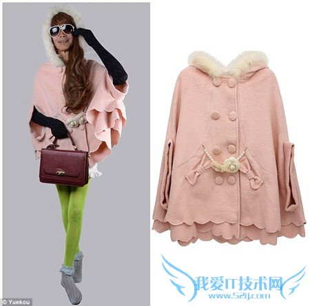 The outfits, designed for teenaged girls, feature bright pink capes, striped tights and over the knee socks, with plenty of lace, ribbon and frippery.这家网店卖的女装主要针对青少年女生,主打单品有亮粉色的斗篷,条纹紧身袜和过膝短袜,衣服也多带蕾丝、绸带和比较艳丽的装饰。