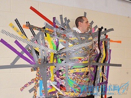 Ryan Castle of Colorado Elementary School let 27 students tape him to a wall at his school. He stayed up there, suspended above the floor, from the morning until lunch time. 科罗拉多小学的校长荣恩·卡索让27名小学生把他绑在学校的墙上。从早上一直到午休时间,他都一直挂在那里,两脚离地。