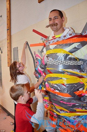 On Wednesday, Jay Woller of La Crescent Elementary School in Minnesota was taped after $21,000 was collected through fundraising.在上周三,明尼苏达州新月小学的校长为了表彰学生们筹集了2万1千元美元的募款,被学生们粘到了墙上。