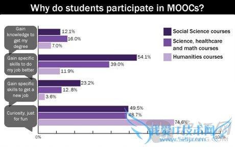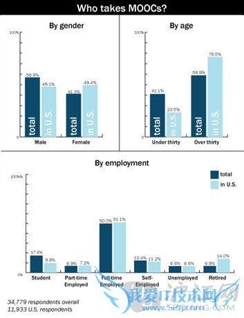 The Coursera student population, in addition to being well-educated, also tends to be young, male and employed, according to the survey. More than 40 percent of MOOC students surveyed were younger than 30, and less than 10 percent were older than 60. About half of all students surveyed said they had enrolled in a MOOC because of “curiosity” or “for fun,” while 44 percent said they had made the decision to sign up in order to “gain specific skills to do my job better.”据调查显示,Coursera教育平台上的学生不仅学历高,而且大多为年轻职场男性。Coursera的学员中年龄不到30岁的人数比例超过40%,而超过60岁的学员人数不到10%。超过半数的受调查学员称,他们报班学习网络公开课是“出于好奇心”或“出于兴趣”。而44%的学生称他们报班学习是为了“获得相关技能以便更好的适应职场”。