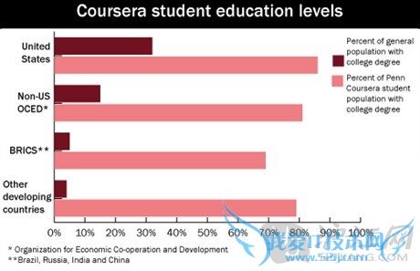 Across all geographic regions, the study found that MOOC students have high levels of educational attainment: 83 percent of those who responded said they had earned either a two- or four-year post-secondary degree, far more than international averages. Educational attainment disparities were especially pronounced in Brazil, Russia, India, China and South Africa, where about 80 percent of MOOC students — compared to just 5 percent of the populations in those countries as a whole — had earned post-secondary degrees.受调查的学生来自全球各地,研究结果显示,他们都接受过较高等水平的教育:其中83%的受调查学生都有两至四年的大专学历,远远高出国际平均教育水平。教育水平差距在巴西、俄罗斯、印度、中国和南非等国尤为明显。在这些国家,80%的大规模开放在线课堂平台学员具有大专学历,而这些国家人口总数中拥有大专学历的人数比例只有5%。