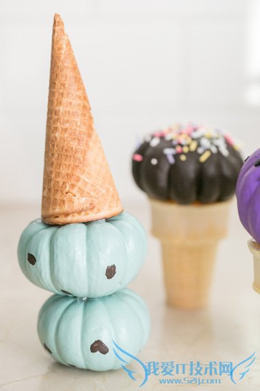 Make this Halloween less scary and more sweet by DIY-ing these no-carve pumpkin ice cream cones!让今年的万圣节少点恐怖多点甜蜜,不要雕刻,把这些南瓜DIY成冰淇淋蛋筒的形状吧!