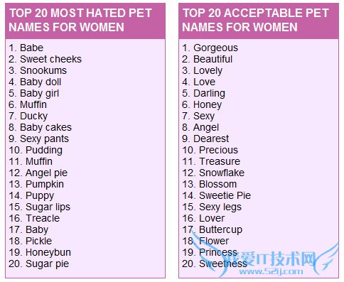 以下为女性最讨厌(左)和最能接受(右)的20个昵称。
