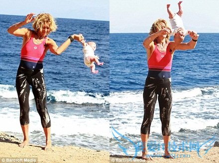 Lena Fokina can be seen flipping a baby over her head in her bizarre 'baby yoga' routine which has been banned from a number of websites for fear that it glorifies child abuse.我们可以看到,莱娜·法姬娜在做她那套奇异的“婴儿瑜伽”常规动作时,将婴儿在头顶甩来甩去,这些图片已被一些网站禁止,唯恐带来宣扬虐待儿童的后果。