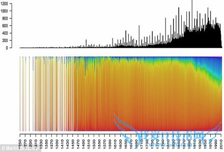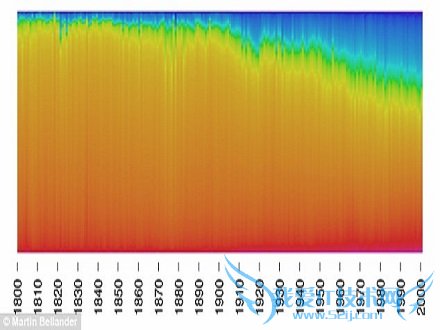 'For example the marked increase of blue at the time of the First World War, might actually reflect a true trend in colour use.' “比如第一次世界大战期间,蓝色的使用频率大大增加,这可能就反应了颜色使用中的一种趋势。”