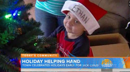 On Oct. 24, the town celebrated Christmas, Ethan's favorite holiday. Neighbors decorated their houses, and Santa and Mrs. Claus (with the town's local fire department) gave Ethan a ride on a fire truck. Carolers sang and the family toured the neighborhood to see the decorations. The next day, the family celebrated Christmas Day, according to the Deseret News.伊桑最喜欢的节日是圣诞节,10月24日小城的居民们又开始举办一系列的圣诞节活动。每家每户都装上了圣诞彩灯,还有市民扮成“圣诞老人”用消防车载着伊桑。大家还一起为伊桑唱圣诞颂歌。第二天,伊桑一家一起庆祝了圣诞节。