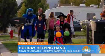 Residents went trick-or-treating on Oct. 21 and Ethan donned a Superman costume, the Deseret News reported. On Oct. 23, a parade was held in town to mark Ethan's fifth birthday, one month early. Darth Vader, Indiana Jones, a bagpiper and dozens of others marched in Ethan's honor, the paper said.10月21日,西乔丹全城的居民们提前庆祝了万圣节,那天伊桑把自己装扮成了超级英雄。10月23日,居民们又提前一个月为伊桑庆祝5岁的生日,大家装扮成“黑武士”、冒险英雄“印第安纳·琼斯”和“风笛手”等各种形象在街上列队游行。