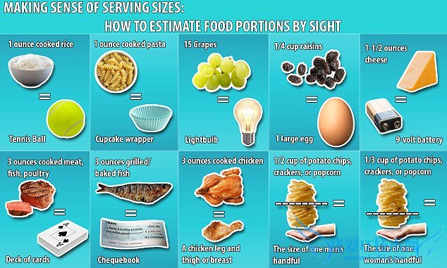 However there is now a simple way to keep an eye on how much food you're consuming, with FEMAIL's food portions graphic.不过,现有一个简单的方法来衡量你的进食量,参考《每日邮报》女性专栏这张食品量表。