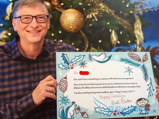 “You and I have something in common: We both hate mosquitos!”Gates wrote in his Secret Santa note. “One of my Secret Santa presents to you is a donation in your name to Malaria No More, because no child should ever die of a mosquito bite.”“你和我有些共同之处:我们都讨厌蚊子!”盖茨在秘密圣诞老人便条中写道。“我给你的秘密圣诞礼物之一便是以你的名义向‘告别疟疾’组织捐赠物资,因为不该有任何儿童死于蚊虫叮咬。”