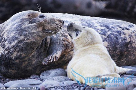 The world can be a scary place for a seal pup less than 72 hours old. But even in the bitter, windswept bleakness of a Scottish beach, a helping hand is never far away. Sealed with a kiss, a young grey seal is seen nurturing her newborn baby through the first few days of its life.对于出生不到三天的海豹幼崽来说,这个世界是个恐怖的地方。然而尽管身陷艰苦,在苏格兰海滩上帮助之手也从未远离。一只年轻的海豹正宠爱地呵护着它刚出生不久的幼崽。