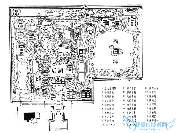 Overview of the original Yuanming Yuan showing twenty-nine man-made structures or scenes mentioned in the book. Plan by Sylvia Lu Wong with reference to the map in YMYJ 1 between pp. 122¨C123 and to He Chongyi, Zeng Zhaofen¡¯s work in YMYJ 1:81¨C92. Ô²Ã÷Ô°Ôò×ÜÀÀ£¬±êʾ³öÊéÖÐÌáµ½µÄ29´¦È˹¤½¨Öþ»ò¾°µã¡£Â½ÉÆÒDzο¼¡¶Ô²Ã÷Ô°¡·µÚ1ÆÚ£¨1981£©122¡ª123Ò³ÖеĵØÍ¼ÒÔ¼°ºÎÖØÒå¡¢ÔøÕÑ·Ü»æÖƵĵØÍ¼£¨ÔØ¡¶Ô²Ã÷Ô°¡·µÚ1ÆÚ£¬81¡ª92Ò³£©µÈ×ÊÁÏ»æÖƶø³É¡£