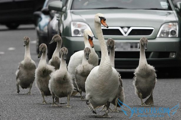 Swanning around: Swans lead their cygnets across a busy Bristol road