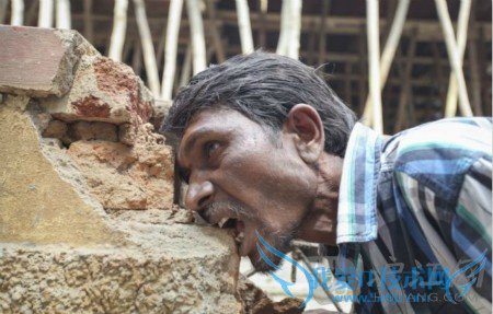 专注吃砖20年:印度异食癖男子超爱啃砖头