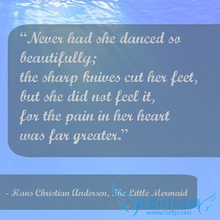 Never had she danced so beautifully; the sharp knives cut her feet, but she did not feel it, for the pain in her heart was far greater.她从没有跳得那么美;锋利的刀伤到了她的脚,但是她没有感觉到,因为她的心远比伤口痛。