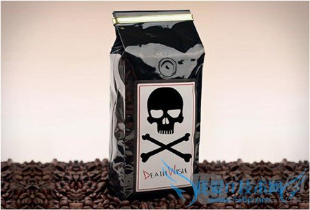 The rather threatening packaging on 'Death Wish Coffee' comes with a skull and crossbones, while a label warns that 'sleepless nights will result'.“死亡之愿”的包装袋有些恐怖,上面印有骷髅和交叉放置的骨头,商标上还警告说:“小心连夜失眠”。