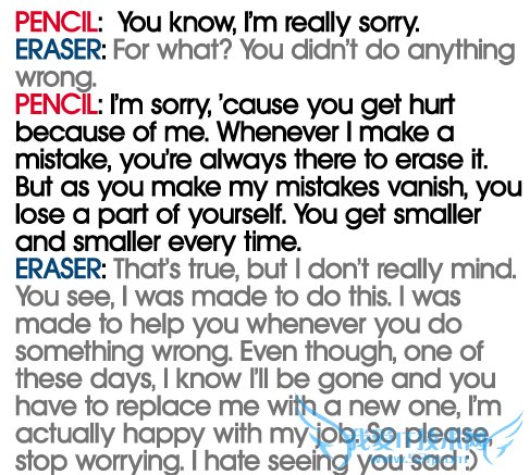 Pencil: I'm sorry, 'cause you get hurt because of me. Whenever I make a mistake, you are always there to erase it. But as you make my mistakes vanish, you lose a part of yourself. You get smaller and smaller everytime. Ǧ±Ê£º¶Ô²»Æð£¬Ã¿´Î¶¼ÊÇÒòΪÎÒ¶øÁ¬ÀÛÄãÊܵ½É˺¦¡£ÎÒ·¸´íµÄʱºò£¬Äã×ÜÊÇ»á°ïÎÒ¾ÀÕý£¬µ«ÔÚ°ïÖúÎÒµÄͬʱ£¬ÄãÏûºÄµÄÈ´ÊÇ×Ô¼ºµÄÉíÌå¡£Äã¿´¿´£¬ÄãÒѾ¿ìÒªÏûʧÁË¡£