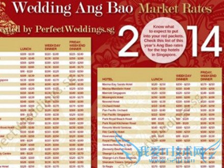 PerfectWeddings.sg recently released the ang bao market rates for weddings in Singapore for the year 2014 on its Facebook page.完美婚礼网最近在它脸书页面发布了2014年婚礼红包市场数额。