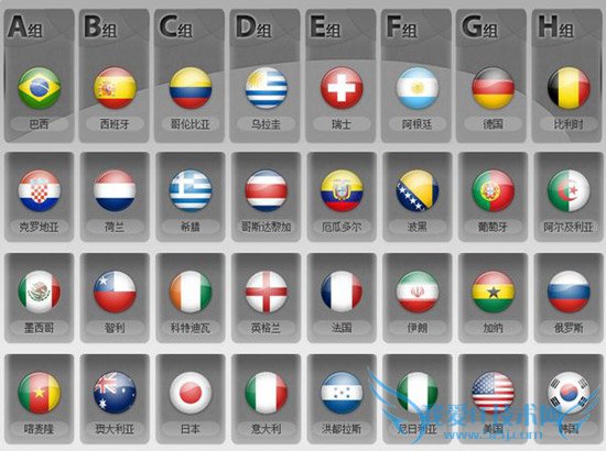 巴西当地时间12月5日,国际足联公布了抽签分档结果,巴西、西班牙、德国、阿根廷、哥伦比亚、比利时、乌拉圭以及瑞士被列为种子队,第二档为南美及非洲球队(智利、厄瓜多尔、科特迪瓦、加纳、阿尔及利亚、尼日利亚、喀麦隆),第三档为亚洲及中北美球队(澳大利亚、伊朗、日本、韩国、哥斯达黎加、墨西哥、洪都拉斯、美国),第四档则是欧洲球队(波黑、克罗地亚、英格兰、法国、希腊、意大利、荷兰、葡萄牙、俄罗斯)。