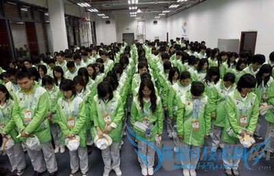 Expo volunteers observe a moment of silence for the victims of Yushu earthquake, Shanghai, April 21, 2010.