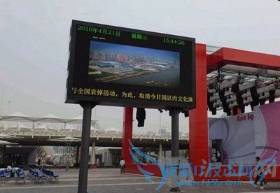 A billboard at Expo park reads "All the cultural performance is cancelled during a national memorial service for the Yushu quake victims" in Shanghai, April 21, 2010.