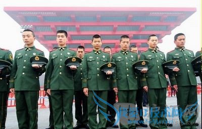 Armed policemen at Shanghai Expo park observe a moment of silence for the victims of Yushu earthquake, Shanghai, April 21, 2010.