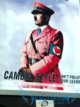 The ads show the Fuhrer in a lurid pink uniform, with his swastika armband replaced with one bearing a bright red heart, above the slogan "Change Style - Don't Follow Your Leader".