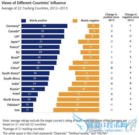 These averages exclude the target country's rating of itself. So for example, the opinions of Germans on Germany are excluded, meaning the country's average rating is based on 21 tracking countries.平均值排除目标国家自己的排名。例如,德国人对德国的排名意见无效,也就是说德国的平均排名是基于21个追踪国家的。