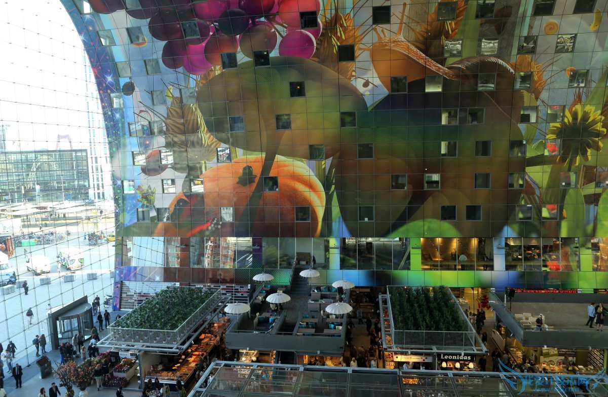 If Amsterdam is a study in old-world elegance, then the port city of Rotterdam is all big, futuristic ambition—and its constantly unfolding city center has become one eye-popping explosion of style. The latest attraction, and reason enough to visit, is the MVRDV-designed Markthal, an igloo-like horseshoe that houses 96 stalls,20 shops, nine restaurants, and 228 apartments. It also happens to feature Holland’s largest artwork.如果说阿姆斯特丹以前是优雅的代名词,那么港口城市鹿特丹则是一座宏伟且颇具未来野心的城市——他不断延伸的中心城区发展之迅速已是让人瞠目结舌之势。而其近来最具吸引力、最值得一看的,则是由著名建筑设计事务所MVRDV设计的Markthal大型拱廊市场,其形状像一个圆顶冰屋,呈马蹄形,里面有96个货摊、20家商店、9家餐厅和228套公寓。这座建筑也是荷兰最大的艺术代表作品.
