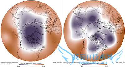 When the jet stream—a result of colder air over the polar region pushing up against warmer air—is strong, the air stays trapped in the vortex above the polar region. But when the jet stream is weak, undulations or kinks in the jet stream cause polar air streams to travel farther south, an arm of cold air breaking out of an icy circle.当由于极地地区上空的冷空气推动热空气造成的高速气流很强的时候,空气会被困在极地地区上空的涡旋中。而当高速气流较弱时,来回波动纠结的高速气流会导致极地空气气流向南快速移动,于是一股冷空气就形成了。