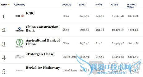 For the first time, China is home to the world’s three biggest public companies and five of the top 10. State-controlled Chinese bank ICBC holds onto its No.1 spot for a second consecutive year, while China Construction Bank takes second place and Agricultural Bank of China moves up five spots to third. They’re joined in the top 10 by the other member of the “Big Four” Chinese banks, Bank of China, at No.9.这是中国首次占据榜单前三甲以及在前10强中占了5名。中国工商银行连续两年占据第1名的宝座,中国建设银行次之,而且中国农业银行向上移动了5名成为第3名。这三大银行与排在第9名的中国银行一起跻身前10强,中国银行是“四大国有银行”中的另一个成员。