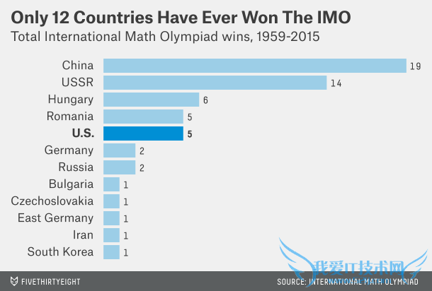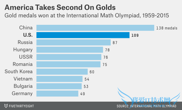 Although the U.S. had been mostly shut out from the top prize, the Americans have put up incredible individual results. The IMO awards gold medals to contestants whose scores place them in approximately the top 8 percent of competitors.3 Since the U.S. began competing in 1974, it has won 109 gold medals, putting it in second place overall. The U.S. ties the USSR for the third-highest rate of gold medals won per competition participated in (2.7 medals), behind China (4.6) and Russia (3.6).虽然美国几乎一直在冠军门外徘徊,但是美国人有着令人难以置信的个人成果。国际数学奥林匹克竞赛将金牌颁给那些成绩能够进入大约前8%的参赛选手。美国自1974年开始参加国际数学奥林匹克竞赛,如今已经获得109块金牌,总数而言位居第二。美国与苏联并列为获得金牌第三多的国家——每场比赛获得2.7块金牌——位于每场比赛获得4.6块金牌的中国和3.6块的俄罗斯之后。