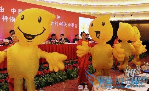 The mascots of Youbaobao for the Oil Pavilion of the forthcoming Shanghai World Expo 2010 make their debu, during the mobilization assembly for the 40-day countdown to the opening of the World Expo Oil Pavilion and public debut of its mascot, jointly spon.-Xinhua