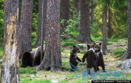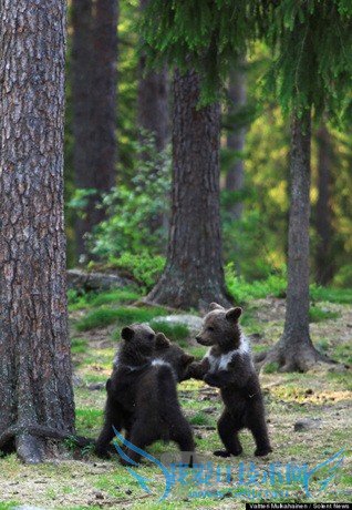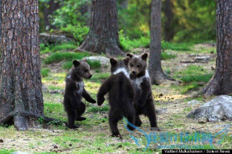 Valtteri Mulkahainen, a 52-year-old PE teacher, spotted the bears while traveling in Finland. He watched the cubs hold each others' hands and dance around in a circle, while Mama bear chaperoned from just a few feet away.52岁的体育教师瓦尔特利·穆克海涅在芬兰旅游的时候发现了这三只跳舞的小熊。他看到这三只小熊手拉着手围成圈跳舞,熊妈妈在数英尺之外看护着它们。