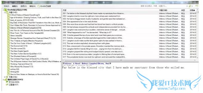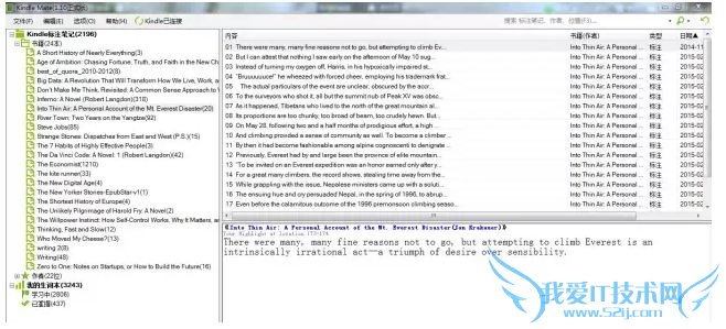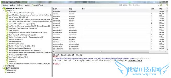 豆瓣上有个小组开发了一款叫Kindle Mate的PC端软件,这款软件有多牛呢?连接kindle后它可以导出所有的生词本,笔记,注释,而且可以根据书籍、作者对标注笔记和生词本进行自动整理分类。这是我电脑上的kindle Mate截图: