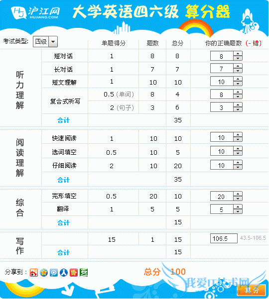 最新版的52ij四六级算分器经过52ij英语多年经验积累和多次研究,摒弃了旧版算分器的不合理因素,计算更精密、也更贴近真实成绩。只要你记得自己的答案,对比52ij网校提供的正确答案,就能在考后第一时间计算出自己的大致分数!