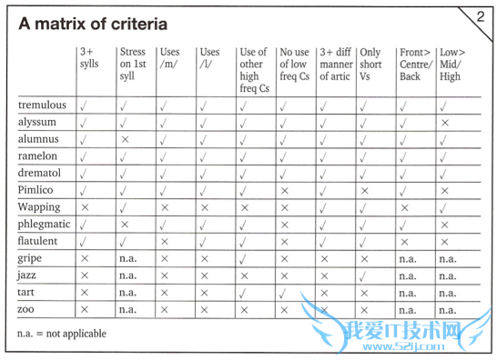例如,"tremulous"(颤抖的)这个单词适用于每个范畴。这个词有三个以上的音节,重音在第一个音节上。它使用了“m”和“l”,这些字母是我们喜欢发音的。这个单词同样用到了英语中其他出现频率很高的辅音,而摒弃了使用频率较低的辅音字母。